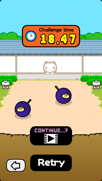 The game follows a ninja who is training to become the uber-ninja. He needs to complete various tasks to advance his training. Each task is simple and time-based: dodge a bouncing head, jump over some rolling fruit, throw a ninja star at static targets etc. Complete the task until the clock runs out to proceed and all movements are done via small finger movements on the screen. Much like the original Flappy Birds, you die. You die a lot. Here is where you have a choice – start again (where the clock is reset) or watch a brief ad for another game (about 15 seconds) and then continue from where the clock left off.